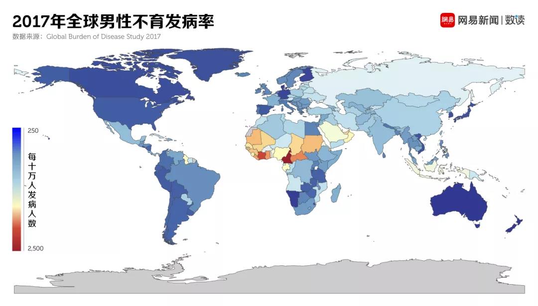 從全球范圍來看,中國的不孕不育率依然處在較高的水平。全球疾病負擔(Global Burden of Disease)的數據顯示,2017年,中國女性的不孕發病率為2705.66例/每十萬人,中國男性的不育發病率為879.32例/每十萬人,比女性略好,但也不樂觀。